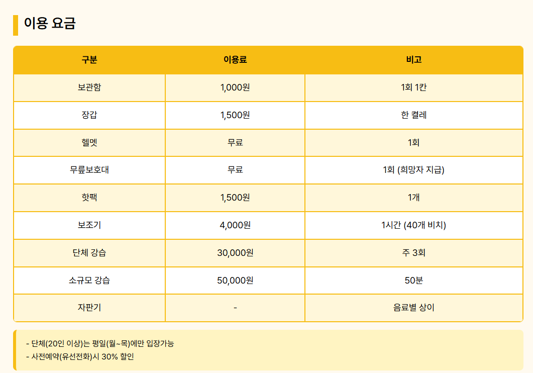 스케이트 초보자나 어린이를 위한 보조기구는 별도 대여가 가능하며, 시간당 추가 요금이 부과됩니다.
